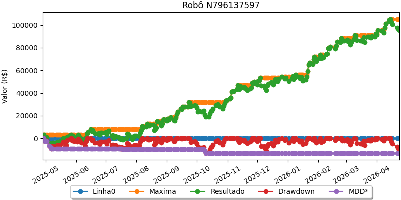 Para robôs que operam em Ibovespa Futuro, é considerado que a operação ocorreu com 5 mini-contratos, de forma que a oscilação mínima de 5 pontos seja igual a R$ 5.